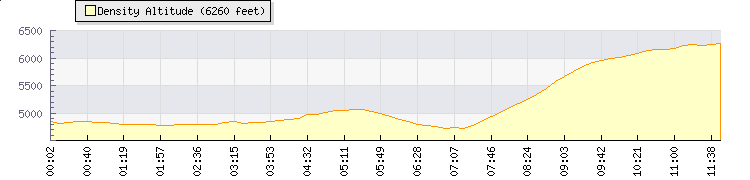| Wind Speed: | 2|3|3 mph | Wind Direction: | ENE 67° | Temperature: | 15.6°C | | Wet Bulb: | 15°C | Discomfort: | 70 | Humidity: | 95% | | Rainfall Today: | 0mm | 12 hrs Rainfall: | 0mm | 24 hrs Rainfall: | 0.5mm | | Barometer: | 1011.5mb | Dew Point: | 14.8°C | Clouds AGL: | 320ft (98 m) | | Density-Alt: | 5909ft (1801 m) | Fire Danger: | |