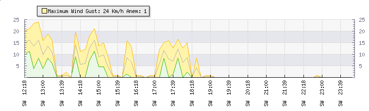 In the last few minutes the wind was South Westerly at an average speed of 0 kmh, reaching up to 0 kmh and a low of 0 kmh. The gust strength is0 kmh above the minimum speed |