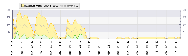 In the last few minutes the wind was Southerly at an average speed of 1 kmh, reaching up to 2 kmh and a low of 0 kmh. The gust strength is2 kmh above the minimum speed |