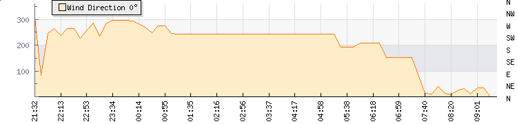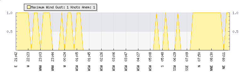 In the last few minutes the wind was South South East at an average speed of 0 knots, reaching up to 0 knots and a low of 0 knots. The gust strength is0 knots above the minimum speed |