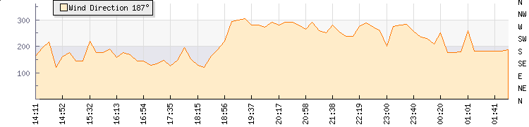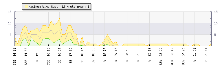 In the last few minutes the wind was Westerly at an average speed of 1 knots, reaching up to 1 knots and a low of 0 knots. The gust strength is1 knots above the minimum speed |