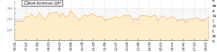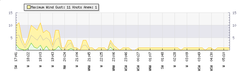 In the last few minutes the wind was South South West at an average speed of 1 knots, reaching up to 3 knots and a low of 0 knots. The gust strength is3 knots above the minimum speed |