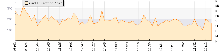 In the last few minutes the wind was South South East at an average speed of 3 knots, reaching up to 5 knots and a low of 2 knots. The gust strength is3 knots above the minimum speed |