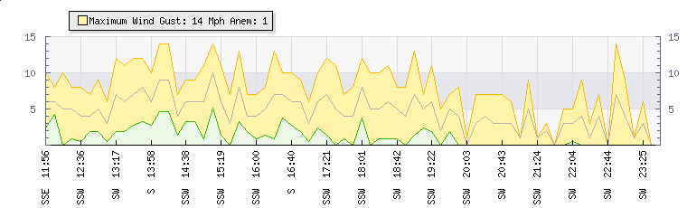 In the last few minutes the wind was South South West at an average speed of 5 mph, reaching up to 9 mph and a low of 0 mph. The gust strength is9 mph above the minimum speed |