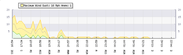 In the last few minutes the wind was Southerly at an average speed of 1 mph, reaching up to 1 mph and a low of 0 mph. The gust strength is1 mph above the minimum speed |