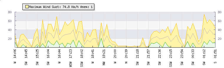 | Wind Gust: | 0 km/h | Min Temp: | 100 °C | Max Temp: | -50 °C | | Wind Average: | 0 km/h | Min Hum: | 100 % | Max Hum: | 0 % | |  |
