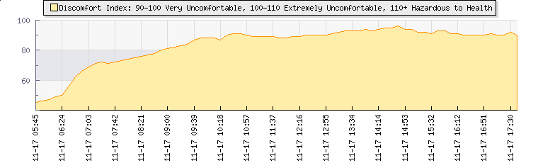 | Wind Speed: | 20|40|60 kmh | Wind Direction: | SSE 158° | Temperature: | 28.6°C | | Wet Bulb: | 18.6°C | Discomfort: | 92 | Humidity: | 36% | | Rainfall Today: | 0mm | 12 hrs Rainfall: | 0mm | 24 hrs Rainfall: | 0mm | | Barometer: | 1019.3mb | Dew Point: | 12.1°C | Clouds AGL: | 6621ft (2018 m) | | Density-Alt: | 3333ft (1016 m) | Solar Radiation: | 585Wm² | Fire Danger: | |