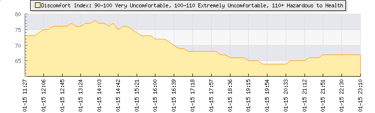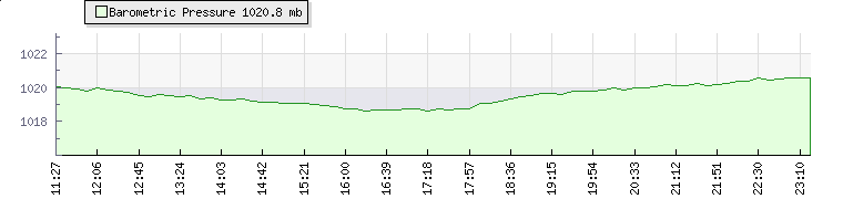 | Wind Speed: | 0|2|3 kmh | Wind Direction: | ESE 121° | Temperature: | 15.6°C | | Wet Bulb: | 12.5°C | Discomfort: | 67 | Humidity: | 73% | | Rainfall Today: | 0mm | 12 hrs Rainfall: | 0mm | 24 hrs Rainfall: | 0mm | | Barometer: | 1020.4mb | Dew Point: | 10.8°C | Clouds AGL: | 1930ft (588 m) | | Density-Alt: | 1798ft (548 m) | Fire Danger: | |