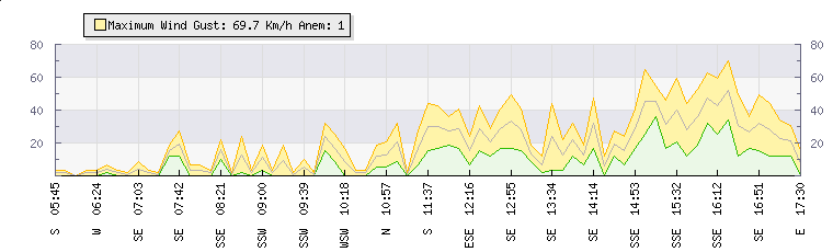 In the last few minutes the wind was South South East at an average speed of 40 kmh, reaching up to 60 kmh and a low of 20 kmh. The gust strength is40 kmh above the minimum speed |