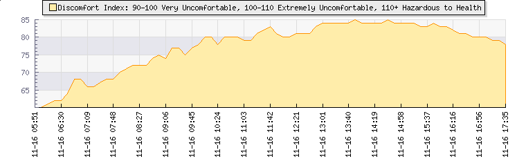 | Wind Speed: | 21|30|39 knots | Wind Direction: | SSE 149° | Temperature: | 24.4°C | | Wet Bulb: | 16.9°C | Discomfort: | 84 | Humidity: | 46% | | Rainfall Today: | 0mm | 12 hrs Rainfall: | 0mm | 24 hrs Rainfall: | 0mm | | Barometer: | 1023mb | Dew Point: | 12°C | Clouds AGL: | 4953ft (1510 m) | | Density-Alt: | 2740ft (835 m) | Solar Radiation: | 633Wm² | Fire Danger: | |