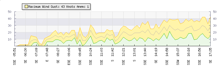 In the last few minutes the wind was South South East at an average speed of 30 knots, reaching up to 39 knots and a low of 21 knots. The gust strength is18 knots above the minimum speed |