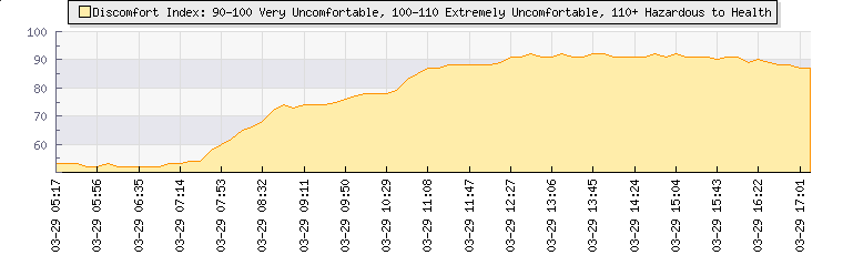 | Wind Speed: | 12|22|32 mph | Wind Direction: | SW 226° | Temperature: | 26.7°C | | Wet Bulb: | 19.2°C | Discomfort: | 90 | Humidity: | 48% | | Rainfall Today: | 0mm | 12 hrs Rainfall: | 0mm | 24 hrs Rainfall: | 0mm | | Barometer: | 1014.9mb | Dew Point: | 14.8°C | Clouds AGL: | 4775ft (1455 m) | | Density-Alt: | 3307ft (1008 m) | Solar Radiation: | 477Wm² | Fire Danger: | |