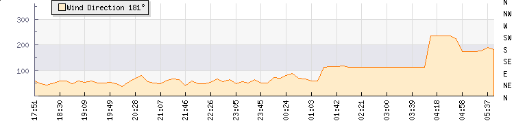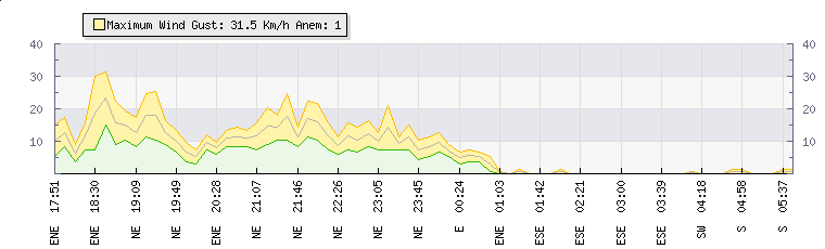 In the last few minutes the wind was North Easterly at an average speed of 11 kmh, reaching up to 15 kmh and a low of 6 kmh. The gust strength is9 kmh above the minimum speed |