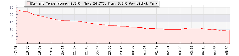 | GPS Co-ordinates: | S 33º 16' 18, E 24º 6' 44 | | ASL: | 2034 feet | | Sunrise / Sunset: | 05:24 / 18:50 | | Beaufort Scale: | Light Breeze |