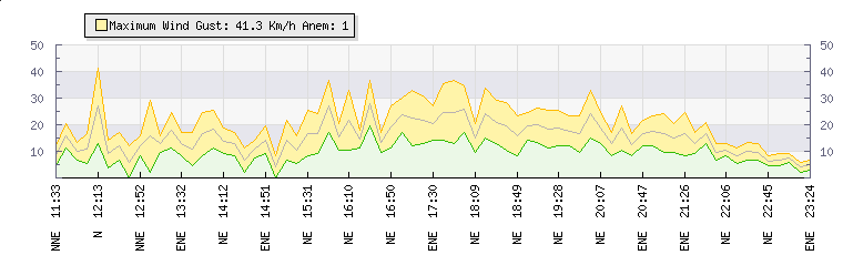 In the last few minutes the wind was North Easterly at an average speed of 13 kmh, reaching up to 17 kmh and a low of 9 kmh. The gust strength is8 kmh above the minimum speed |