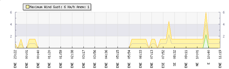 In the last few minutes the wind was East South East at an average speed of 1 kmh, reaching up to 2 kmh and a low of 0 kmh. The gust strength is2 kmh above the minimum speed |