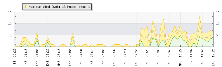 In the last few minutes the wind was North Easterly at an average speed of 4 knots, reaching up to 6 knots and a low of 3 knots. The gust strength is3 knots above the minimum speed |