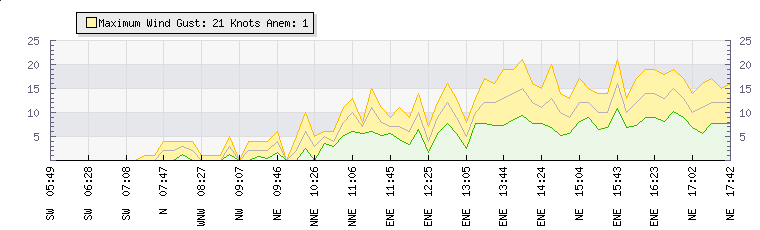 In the last few minutes the wind was North Easterly at an average speed of 15 knots, reaching up to 19 knots and a low of 10 knots. The gust strength is9 knots above the minimum speed |