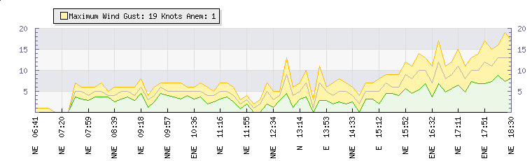 In the last few minutes the wind was North Easterly at an average speed of 12 knots, reaching up to 17 knots and a low of 7 knots. The gust strength is10 knots above the minimum speed |