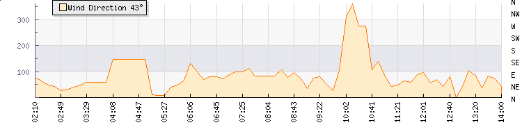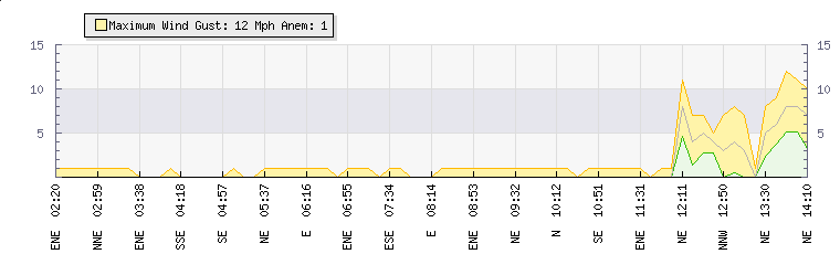 In the last few minutes the wind was Easterly at an average speed of 4 mph, reaching up to 5 mph and a low of 3 mph. The gust strength is2 mph above the minimum speed |