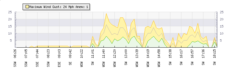 In the last few minutes the wind was South Westerly at an average speed of 7 mph, reaching up to 10 mph and a low of 4 mph. The gust strength is6 mph above the minimum speed |