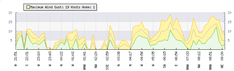 In the last few minutes the wind was Easterly at an average speed of 4 knots, reaching up to 5 knots and a low of 2 knots. The gust strength is3 knots above the minimum speed |