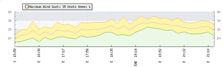 In the last few minutes the wind was Easterly at an average speed of 19 knots, reaching up to 26 knots and a low of 12 knots. The gust strength is14 knots above the minimum speed |