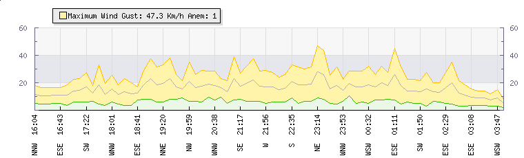 Weather Summary: In the last few minutes the wind was North North West at an average speed of 14 kmh, reaching up to 20 kmh and a low of 7 kmh. The gust strength is13 kmh above the minimum speed