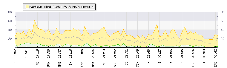 Weather Summary: In the last few minutes the wind was East South East at an average speed of 19 kmh, reaching up to 34 kmh and a low of 5 kmh. The gust strength is29 kmh above the minimum speed