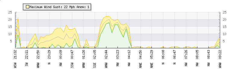 Wind Gust: | 22 mph | Min Temp: | 13.8 °C | Max Temp: | 17.4 °C | Wind Average: | 20 mph | Min Hum: | 87 % | Max Hum: | 94 % | |  |