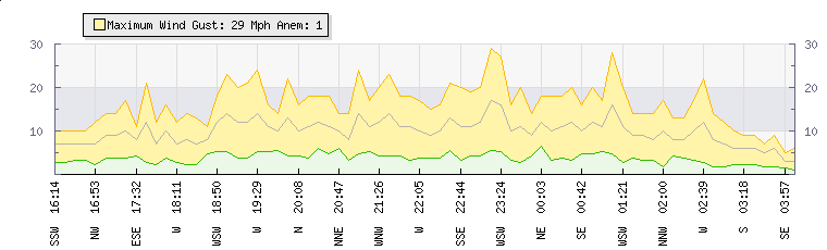 | Wind Gust: | 28 mph | Min Temp: | 23.8 °C | Max Temp: | 24.4 °C | | Wind Average: | 16 mph | Min Hum: | 63 % | Max Hum: | 66 % | |  |