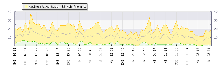 In the last few minutes the wind was East South East at an average speed of 12 mph, reaching up to 21 mph and a low of 3 mph. The gust strength is18 mph above the minimum speed |