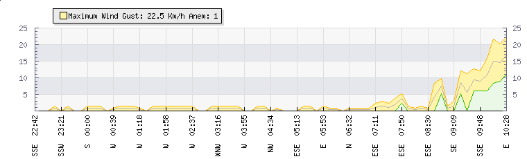 In the last few minutes the wind was East South East at an average speed of 1 kmh, reaching up to 1 kmh and a low of 0 kmh. The gust strength is1 kmh above the minimum speed |