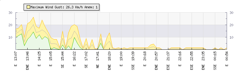 In the last few minutes the wind was East North East at an average speed of 1 kmh, reaching up to 2 kmh and a low of 0 kmh. The gust strength is2 kmh above the minimum speed |