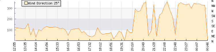 In the last few minutes the wind was East North East at an average speed of 5 kmh, reaching up to 11 kmh and a low of 0 kmh. The gust strength is11 kmh above the minimum speed |