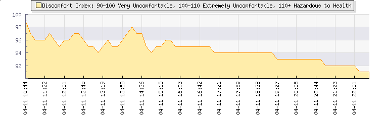 | Wind Speed: | 2|5|9 kmh | Wind Direction: | - -° | Temperature: | 23.8°C | | Wet Bulb: | 22°C | Discomfort: | 92 | Humidity: | 86% | | Rainfall Today: | 0mm | 12 hrs Rainfall: | 0mm | 24 hrs Rainfall: | 0mm | | Barometer: | 1003.7mb | Dew Point: | 21.3°C | Clouds AGL: | 996ft (304 m) | | Density-Alt: | 2283ft (696 m) | Fire Danger: | |