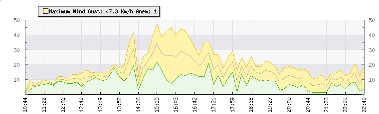 | Wind Gust: | 47 km/h | Min Temp: | 22.1 °C | Max Temp: | 31.5 °C | | Wind Average: | 35 km/h | Min Hum: | 50 % | Max Hum: | 90 % | |  |