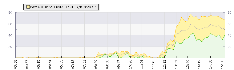 In the last few minutes the wind was blowing at an average speed of 50 kmh, reaching up to 67 kmh and a low of 33 kmh. The gust strength is34 kmh above the minimum speed |