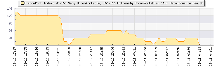 | Wind Speed: | 4|8|12 knots | Wind Direction: | - -° | Temperature: | 24.5°C | | Wet Bulb: | 22.3°C | Discomfort: | 93 | Humidity: | 83% | | Rainfall Today: | 0mm | 12 hrs Rainfall: | 0mm | 24 hrs Rainfall: | 0mm | | Barometer: | 998.9mb | Dew Point: | 21.4°C | Clouds AGL: | 1234ft (376 m) | | Density-Alt: | 2520ft (768 m) | Fire Danger: | |
