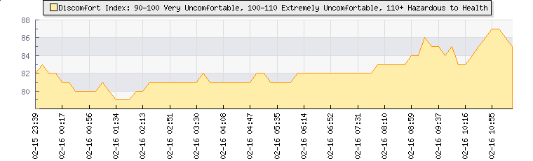 | Wind Speed: | 0|1|2 knots | Wind Direction: | - -° | Temperature: | 21.9°C | | Wet Bulb: | 18.1°C | Discomfort: | 83 | Humidity: | 70% | | Rainfall Today: | 0mm | 12 hrs Rainfall: | 0mm | 24 hrs Rainfall: | 0mm | | Barometer: | 1010.7mb | Dew Point: | 16.2°C | Clouds AGL: | 2291ft (698 m) | | Density-Alt: | 1732ft (528 m) | Fire Danger: | |