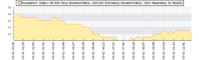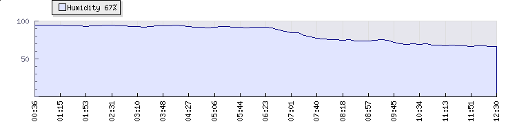 | Wind Speed: | 12|19|26 knots | Wind Direction: | - -° | Temperature: | 20.9°C | | Wet Bulb: | 16.8°C | Discomfort: | 80 | Humidity: | 68% | | Rainfall Today: | 2.4mm | 12 hrs Rainfall: | 4mm | 24 hrs Rainfall: | 4mm | | Barometer: | 1002.9mb | Dew Point: | 14.7°C | Clouds AGL: | 2453ft (748 m) | | Density-Alt: | 1860ft (567 m) | Fire Danger: | |