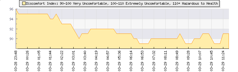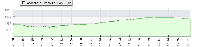 | Wind Speed: | 4|5|6 knots | Wind Direction: | - -° | Temperature: | 22.5°C | | Wet Bulb: | 21.9°C | Discomfort: | 90 | Humidity: | 95% | | Rainfall Today: | 0.5mm | 12 hrs Rainfall: | 0.5mm | 24 hrs Rainfall: | 0.5mm | | Barometer: | 1000.8mb | Dew Point: | 21.7°C | Clouds AGL: | 337ft (103 m) | | Density-Alt: | 2238ft (682 m) | Fire Danger: | |