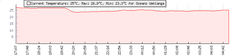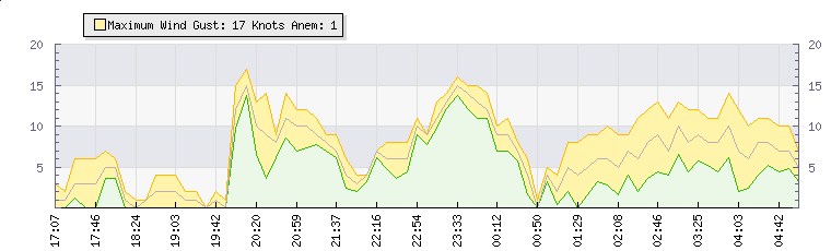 | Wind Gust: | 13 knots | Min Temp: | 24.1 °C | Max Temp: | 25.1 °C | | Wind Average: | 10 knots | Min Hum: | 82 % | Max Hum: | 90 % | |  |