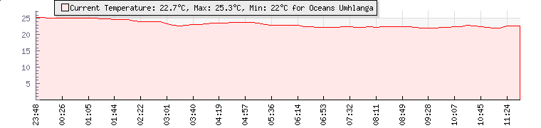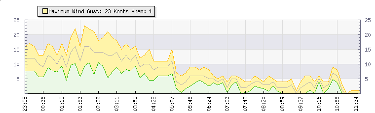 | Wind Gust: | 23 knots | Min Temp: | 22 °C | Max Temp: | 25.2 °C | | Wind Average: | 16 knots | Min Hum: | 83 % | Max Hum: | 97 % | |  |