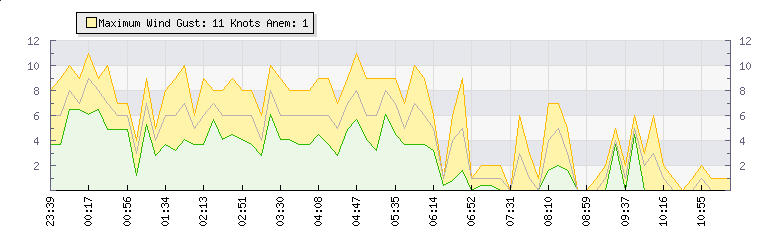 | Wind Gust: | 11 knots | Min Temp: | 19.7 °C | Max Temp: | 22.9 °C | | Wind Average: | 9 knots | Min Hum: | 67 % | Max Hum: | 80 % | |  |