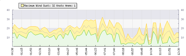 | Wind Gust: | 32 knots | Min Temp: | 18.9 °C | Max Temp: | 21.3 °C | | Wind Average: | 24 knots | Min Hum: | 68 % | Max Hum: | 95 % | |  |