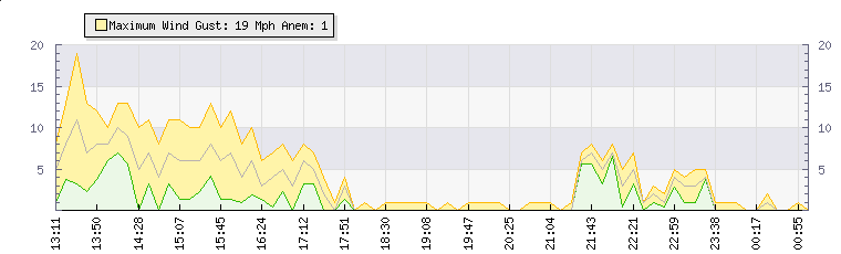 | Wind Gust: | 29 mph | Min Temp: | 19.9 °C | Max Temp: | 21.3 °C | | Wind Average: | 24 mph | Min Hum: | 89 % | Max Hum: | 96 % | |  |