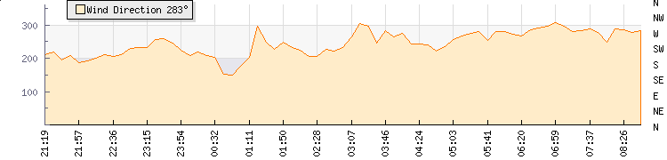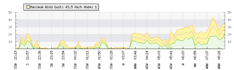 In the last few minutes the wind was Westerly at an average speed of 6 kmh, reaching up to 11 kmh and a low of 2 kmh. The gust strength is9 kmh above the minimum speed |