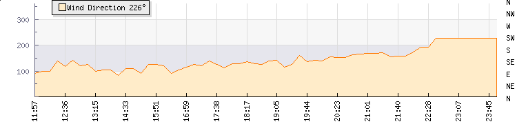 In the last few minutes the wind was South South East at an average speed of 0 kmh, reaching up to 0 kmh and a low of 0 kmh. The gust strength is0 kmh above the minimum speed |