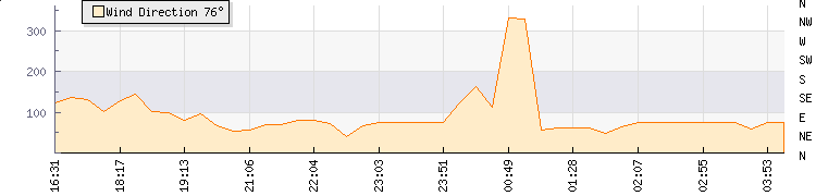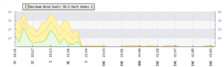 In the last few minutes the wind was East North East at an average speed of 0 kmh, reaching up to 0 kmh and a low of 0 kmh. The gust strength is0 kmh above the minimum speed |